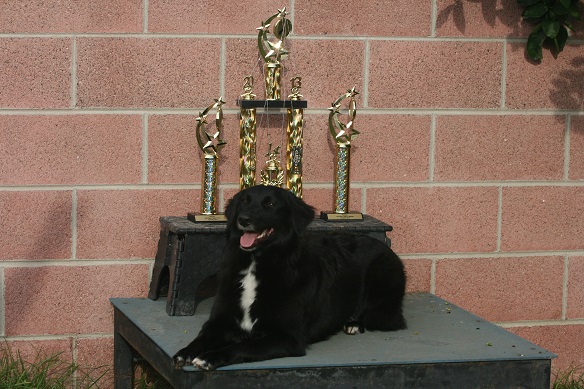 With the 3rd place overall on Saturday combined with 2nd place Sunday, Muse won the 2013 PCCDC Championship… at just 11 months old. Wow! There were a lot of awards given out for this competition for the various events and the combined events for the weekend. Muse won 7 of the 8 possible awards she was able to win, which is astonishing. Here is the rundown of what she won: 2013 PCCDC Champion, PCCDC Freestyle Champion, PCCDC Toss/Fetch 2nd Place, UFO Major 3rd place overall, UFO Major 3rd place freestyle, Men’s D-Tour 2nd place, Women’s D-Tour 3rd place. Here is a picture of Muse with six of her awards (Ellie has the award she earned with Muse). The D-Tour and UFO awards are dog tags hanging from the big championship trophy: