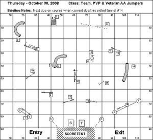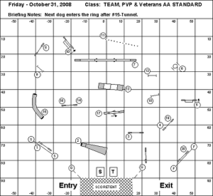 The other place I handled them differently was from the 12 tunnel to the weaves. For Enzo I pulled to the 13 jump and then rear crossed jump 15. The line from 13 to 15 on the actual course was a little straighter than on the map which was why I didn’t cross behind number 14. With Tooney I front crossed on the landing side of jump 13. That almost pushed her out to the off course jump. I didn’t want to handle that line with her the way that I did for Enzo because I was worried that the rear cross would pull her off the weave entrance. Enzo actually has better weave entrances than Tooney does, but is not as good with me leaving him laterally in the weaves.